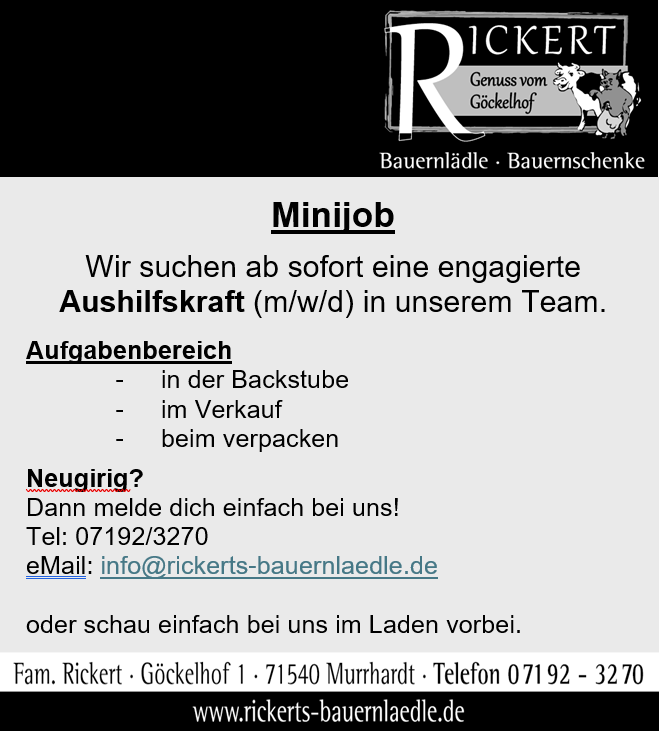 Sie sind auf der Suche nach frischen landwirtschaftlichen Produkten direkt vom Bauernhof? Dann sind Sie beim Bauernlädle Rickert genau richtig! Unser Laden auf dem Göckelhof ist auf den Verkauf von qualitativ hochwertigen landwirtschaftlichen Erzeugnissen spezialisiert. Unser Hof legt großen Wert auf Frische, Qualität und Nachhaltigkeit. In unserem Bauernlädle finden Sie eine vielfältige Auswahl an Obst, Gemüse, Eiern, Milchprodukten, Fleisch und vielem mehr. Besuchen Sie uns und lassen Sie sich von unserem breiten Sortiment überzeugen. Wir stehen Ihnen gerne mit einer persönlichen Beratung zur Seite und bieten Ihnen hochwertige landwirtschaftliche Erzeugnisse, die direkt vom Bauernhof zu Ihnen nach Hause kommen.